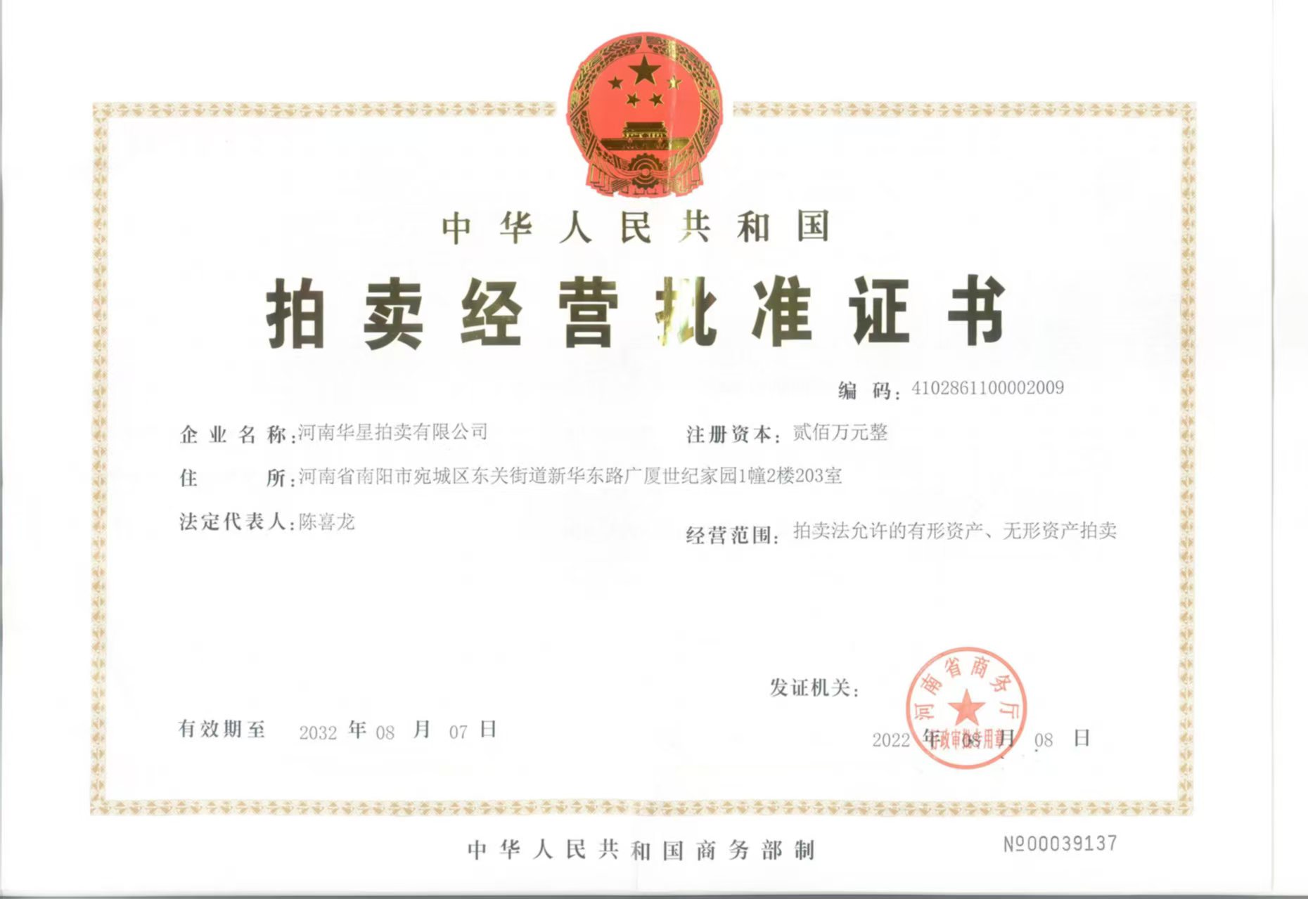 2013年7月取得南陽市人民政府指定、河南省財政廳頒發(fā)河南省公物拍賣資格證書
